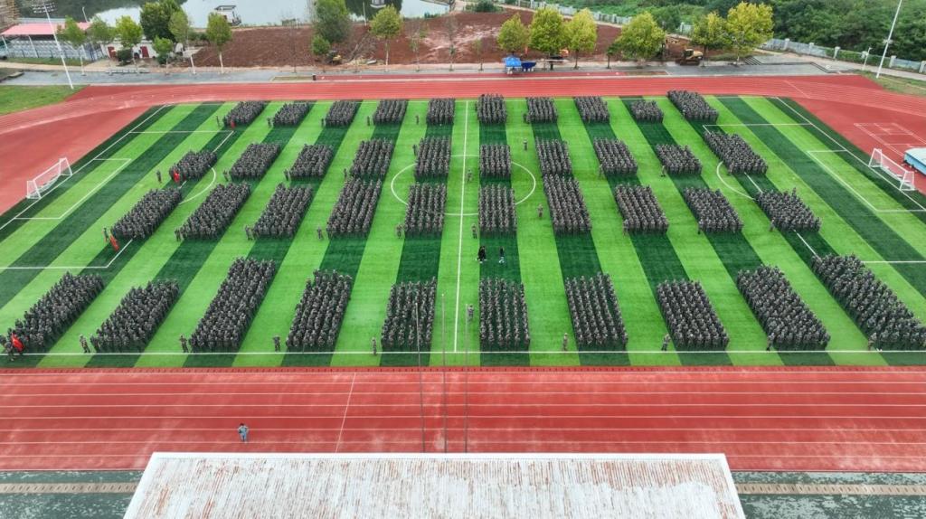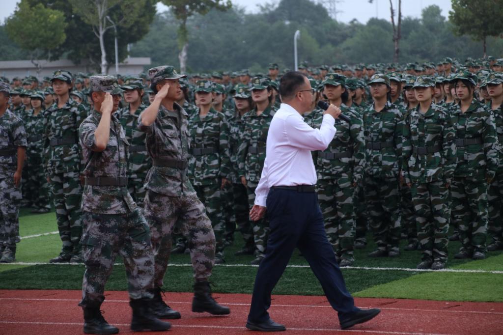 大会在庄严的国歌声中拉开序幕。王玉才、姚祖军分别在承训部队教官的陪同下检阅了两校区的学生方队。随后的分列式表演中,2023级新生们身着迷彩军装,英姿飒爽、意气风发,以整齐划一的方队、铿锵有力的步伐依次走过主席台,尽显蓬勃朝气与青春活力。全体新生齐声高唱《强军战歌》,传达水院学子永远跟党走的坚定信念和强烈的爱国报国之情,以实际行动高质量完成军训第一课。