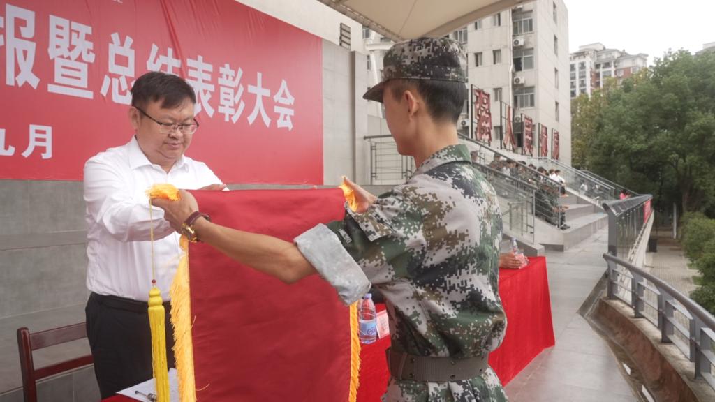 学院领导向两校区优胜方队和学生教官颁发锦旗和证书