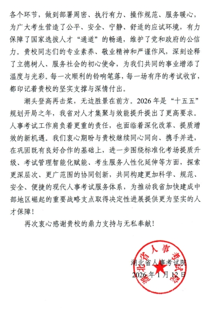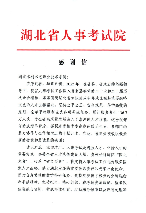 近日,湖北省人事考试院向我院发来感谢信,对我院在2025年全省人事考试保障工作中的辛勤付出与突出贡献表示高度肯定和诚挚感谢。这既是对我院以往工作的认可,更是对今后继续提升服务水平的激励与鞭策。