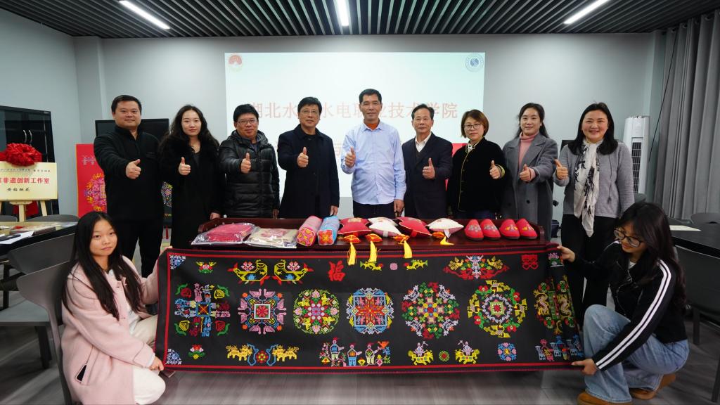 活动中,黄梅挑花国家级非遗传承人常海军开展专题授课,通过经典作品展示,讲解黄梅挑花的历史渊源、工艺特点及吉祥纹样寓意。随后,庹祖明与常海军共同为“非遗创新工作室”揭牌,明确工作室以技艺传承、文创研发、教学实践为核心宗旨。学院还为常海军颁发兼职导师聘书,助力非遗教学与人才培养。