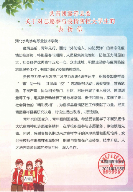 (张艺蕾)3月31日,院团委收到了一封来自共青团嘉祥县委的表扬信。信中,对我院电力电子工程系发电厂及电力系统4班的李运丰同学提出表扬。李运丰积极参加“青”助一线,共同战“疫”志愿服务活动,表现突出,甘冒危险,用实际行动诠释了勇敢与坚强、责任和担当,为嘉祥县疫情防控工作贡献了力量。
