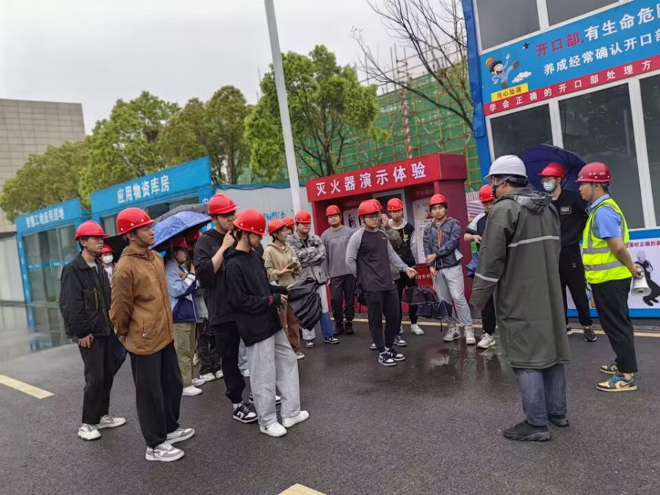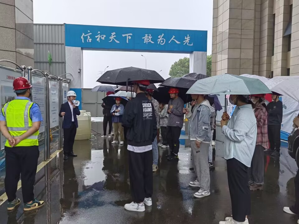 “今天虽然天气不好,但还是选择让大伙儿继续参观学习,就是让大家看看真正工程人的工作环境及平时是怎么工作的,希望同学们披荆斩棘,一路向上。”在进场前的安全教育环节,现场总监于工语重心长地对同学们说。在实训参观过程中,于总监和鲍总工冒雨饱含激情地讲解介绍,同时对学生提出来的各种疑问耐心且幽默地解答,让学生对未来的工作岗位充满期待。一方面,安全教育让学生切实体会到在未来岗位中自身安全及现场安全管理的重要性,将理论知识真正运用到实际工程中。另一方面,建筑系课程案例取自实践,使课堂更丰富,让学生学习态度更主动。