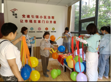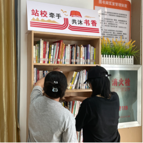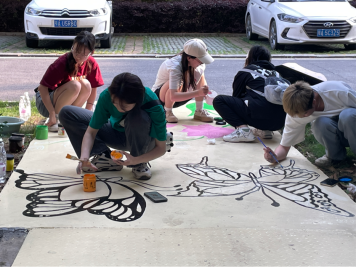 志愿者还协助社区完成了装饰地面的工作。学生围绕主题有序分工,为书屋增添趣味和观赏性贡献自己的力量。
