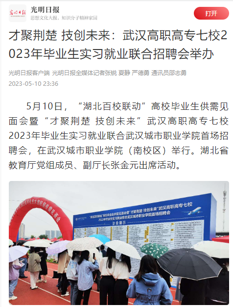 湖北省教育厅组织武汉城市职业学院等七所高职高专院校,于2023年5月10日-19日共同举办“湖北百校联动”高校毕业生供需见面会暨“才聚荆楚 技创未来”武汉高职高专七校2023年毕业生实习就业联合招聘会。